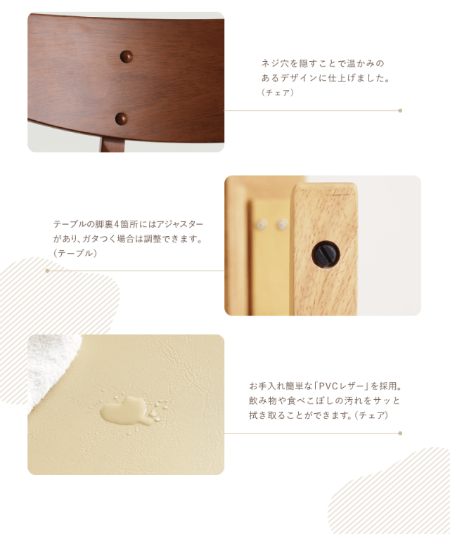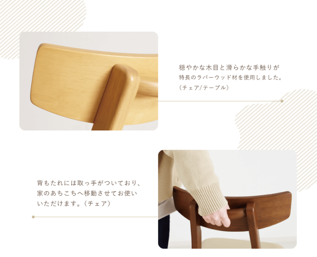 | 材質 | ≪ テーブル ≫ 天板:ラバーウッド,ウォールナット突板 脚部:ラバーウッド 塗装:ウレタン ≪ チェア ≫ 木部:ラバーウッド 張地:PVC(合皮) 塗装:ウレタン |