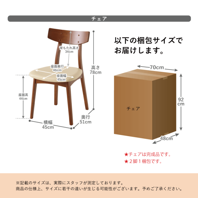 お客様組立て 【ナチュラル】3梱包(天板・脚・チェア)、 【ダークブラウン】2梱包(テーブル・チェア)でお届けします ※カラーによってお届け時の梱包数がことなります。 ※天板仕様は、ナチュラル「ラバーウッド」、ダークブラウン「ウォールナット突板」となっております。 ※モニター環境により、発色・素材感に差異が生じる場合がございます。ご不安な方は無料サンプルにて見本をご確認ください。 |