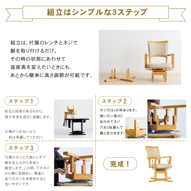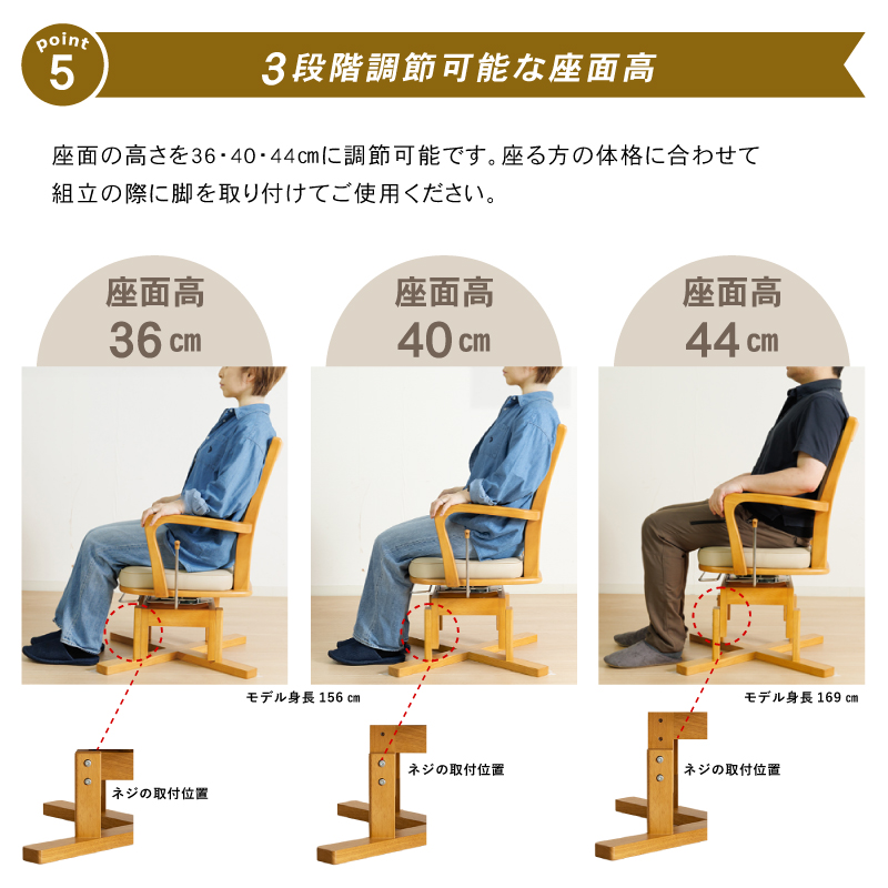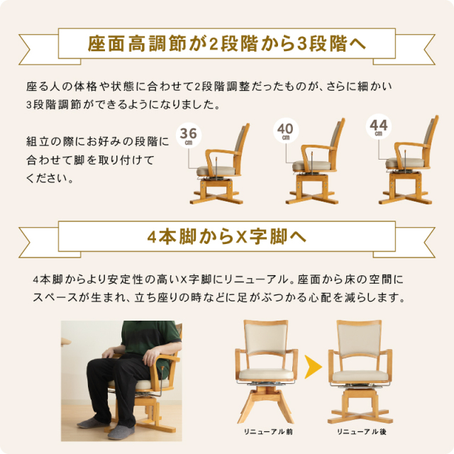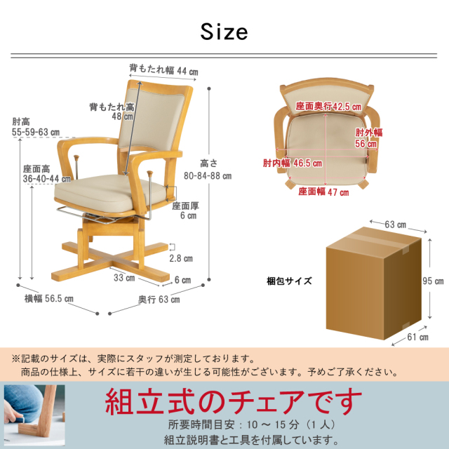 | サイズ | 幅56.5×奥行63×高さ80・84・88cm (座面高36・40・44cm/肘高63.5cm) |
