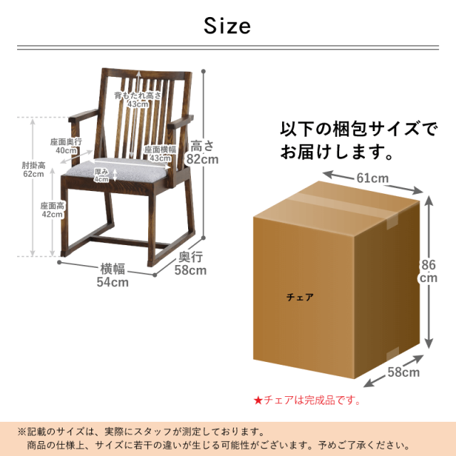 | サイズ | 幅54 × 奥行58 × 高さ82cm (座面高42cm / 肘高62cm) |