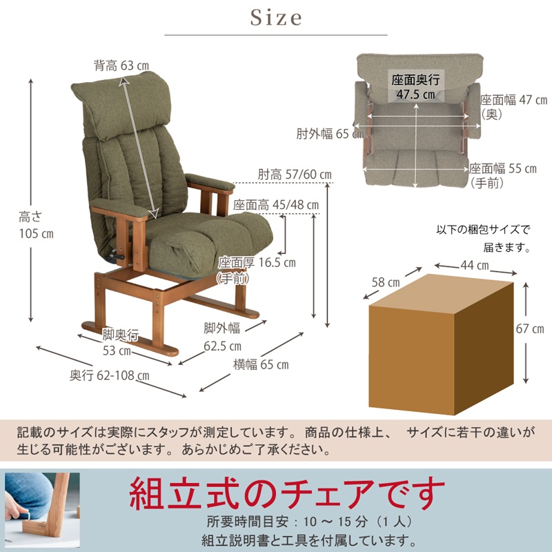 | サイズ | 幅65×奥行64-108×高さ105cm(座面高45,48cm/肘高57,60cm) |