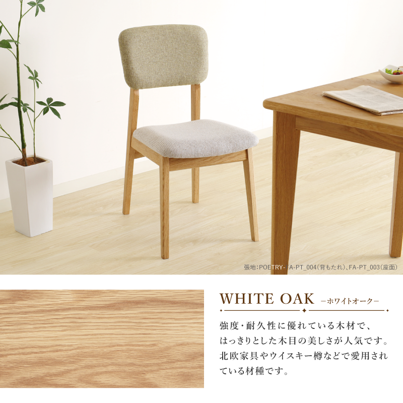 | 材質 | 木部: ホワイトオーク材 張地: PVC(合成皮革) , ファブリック(布) 塗装: オイル |