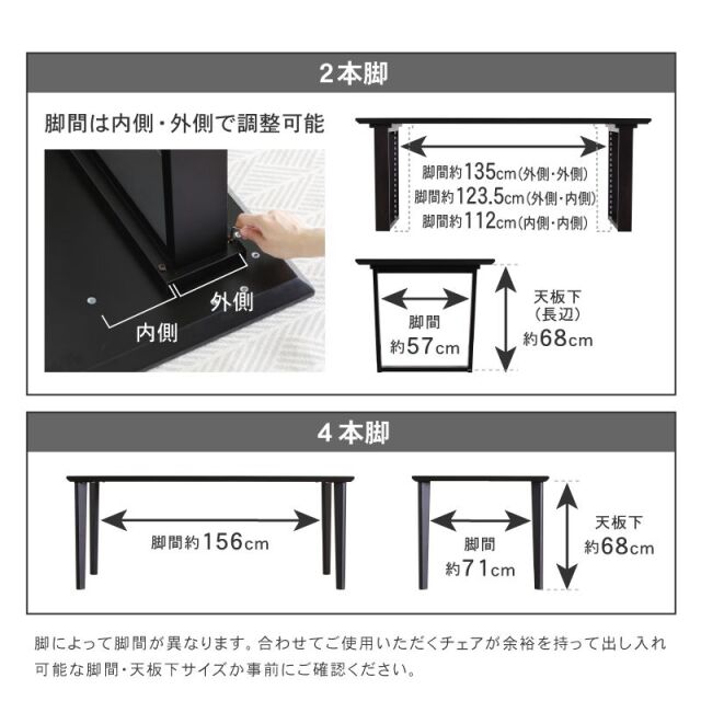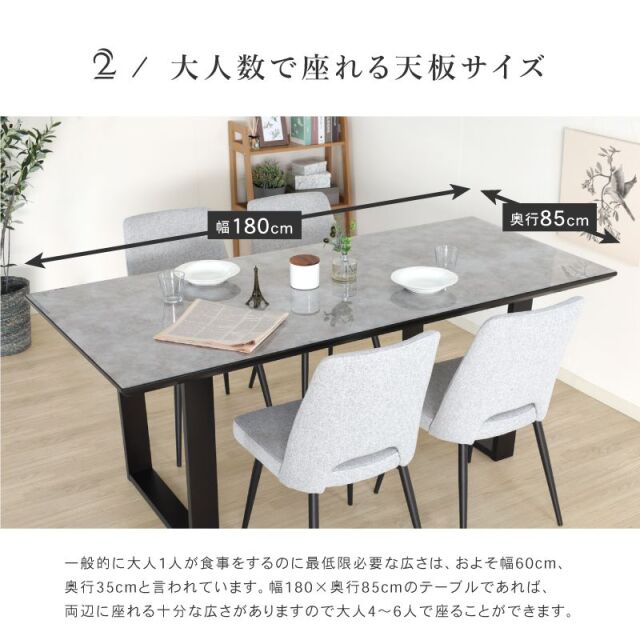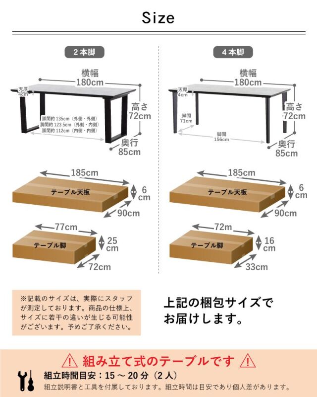 | サイズ | 幅180×奥行85×高さ72cm(天厚4cm/脚間112cm,123.5cm,135cm[156cm]) ※[]の数値は「4本脚タイプ」の寸法 |