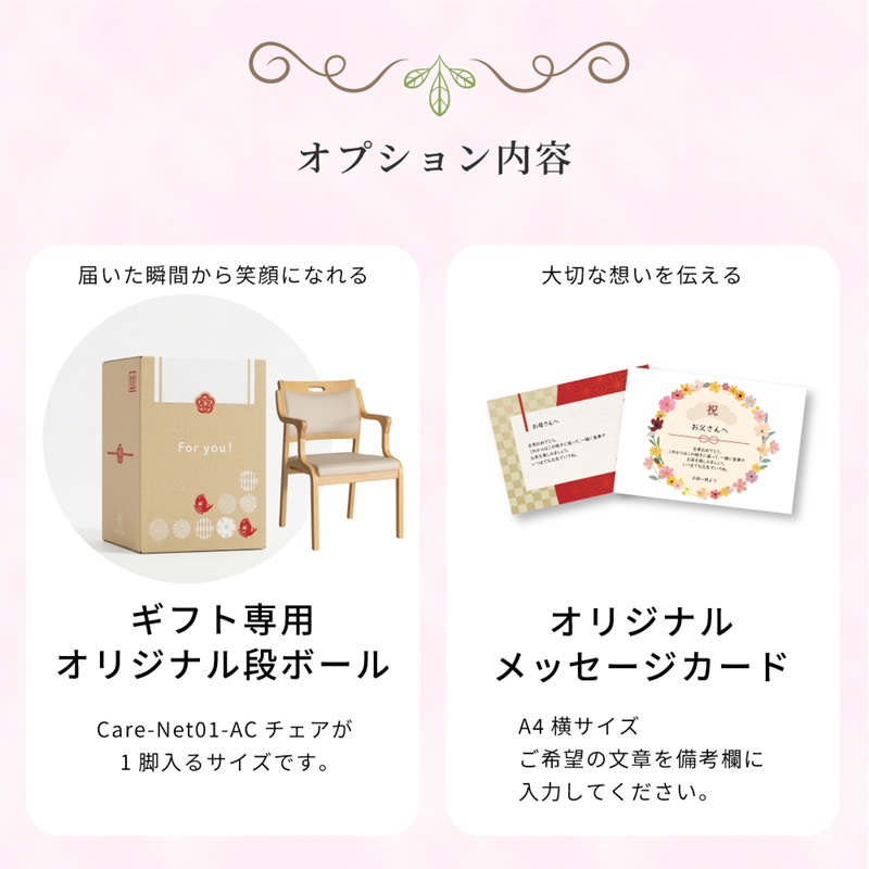 椅子の工場TOP カテゴリから探すオプション品 プレゼント用ダンボール プレゼントボックス 贈り物用 お祝い用 贈答用 箱 梱包材 父の日 母の日 敬老の日 価格: ¥3,000 (税込) [ポイント還元 30ポイント~] 販売期間: 数量: 枚 在庫 ○ 返品についての詳細はこちら 注文方法 本商品でのお届けをご希望する商品(木製椅子)と同じカートに入れてご購入ください 対象商品 Care-Net01-AC / Care-111-FLG / Care-116-AC 注意事項 ※1点につき1商品となります。2脚以上の複数でご希望の方は、その数量分カートに入れてご購入ください ※本オプションのみのご購入は出来ません