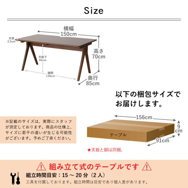 | サイズ | 幅150×奥行85×高さ70cm(天厚2.5/脚間130cm) |