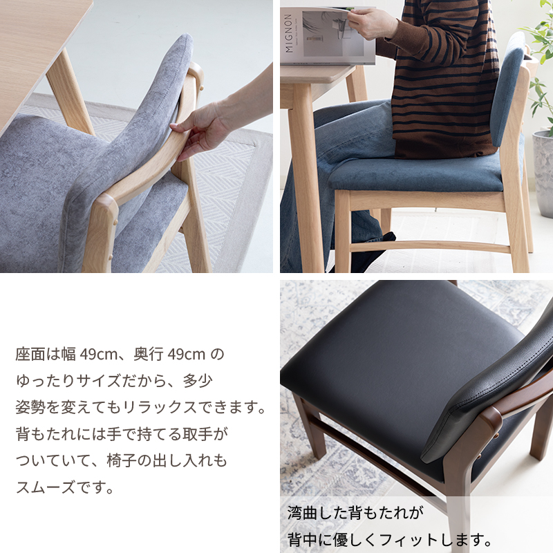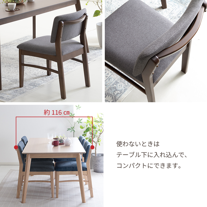 | 材質 | ≪ テーブル ≫ 天板:オーク突板 , ウォールナット突板 脚部:ラバーウッド 塗装:ウレタン塗装 ≪ チェア ≫ 木部:ラバーウッド 張地:合皮 , ファブリック 塗装:ウレタン塗装 |