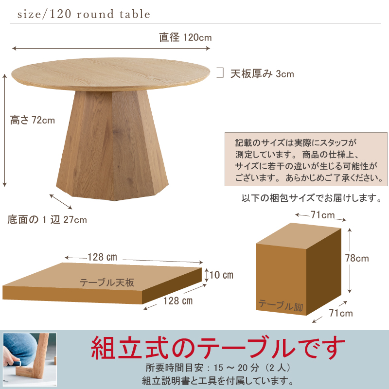 | サイズ | 幅120×奥行120×高さ72cm(天厚3cm) |