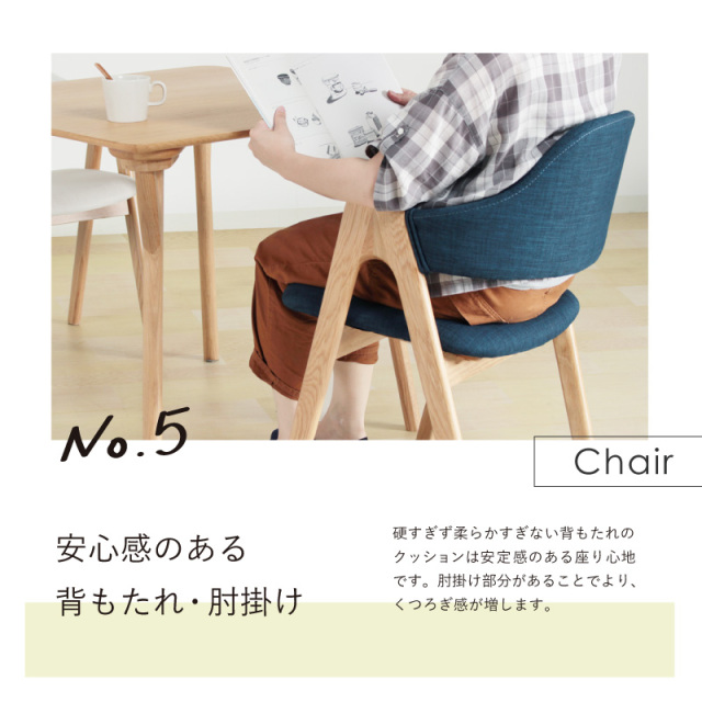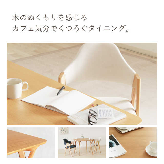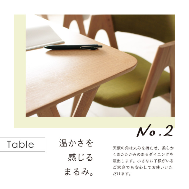 | 材質 | ≪テーブル≫ 天板:ナラ突板 , 脚:ナラ材 / 塗装:ウレタン ≪チェア≫ 木部:ナラ材 / 張地:ファブリック(布) / 塗装:ウレタン |