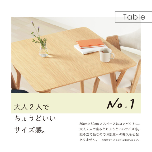 | サイズ | ≪テーブル≫ 幅:80cm × 奥行:80cm × 高さ:70cm (脚間:63cm / 天厚:1.8cm) ≪チェア≫ 幅:52cm × 奥行:57cm × 高さ:80cm (座面高:43cm / 肘高:63cm) |