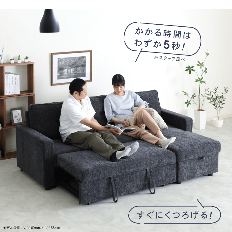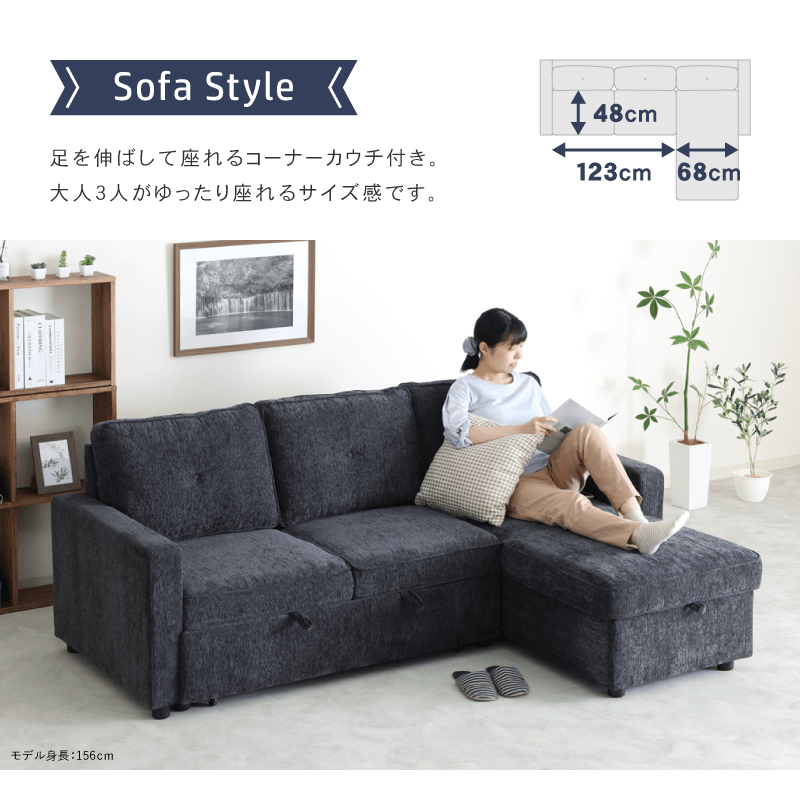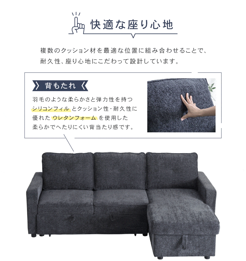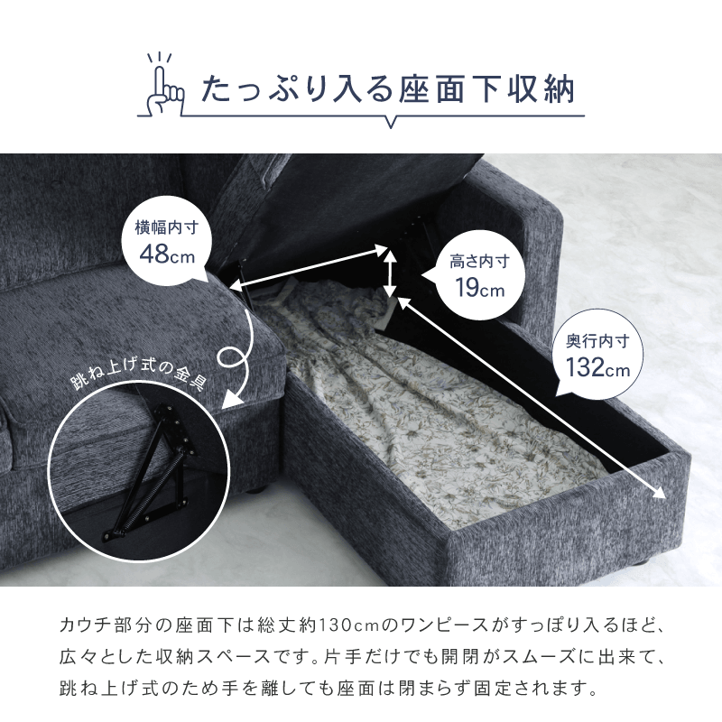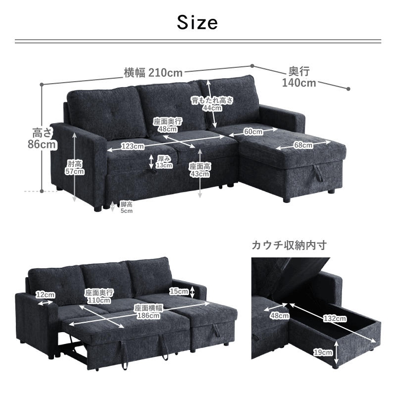 | サイズ | 幅210×奥行140×高さ86cm(座面高43cm/肘高57cm) ≪カウチ内収納庫≫幅48×奥行132×高さ19cm |