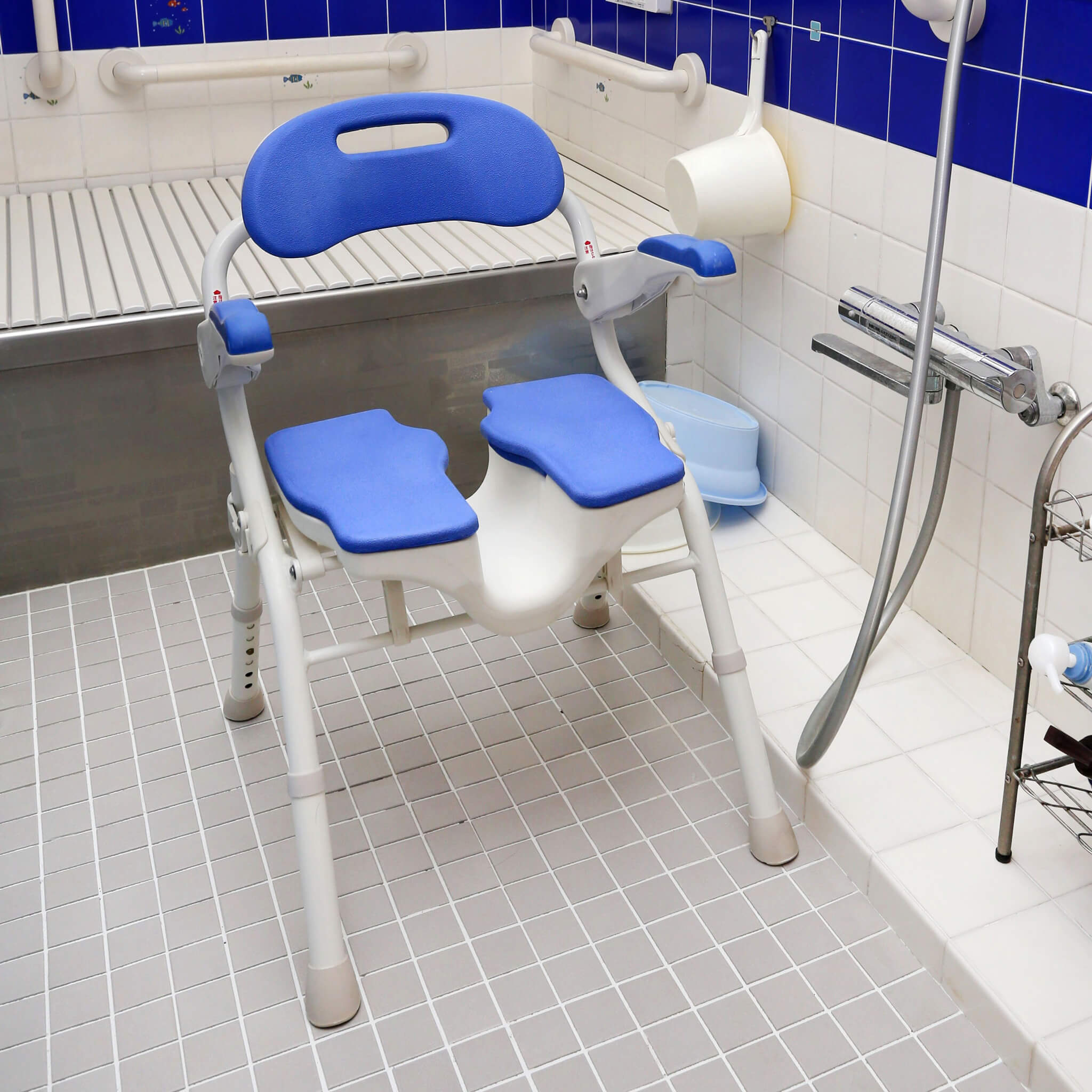 シャワーチェアは、足腰が弱くなってきた方や姿勢が不安定な方が、安全に入浴できるような工夫がされています。