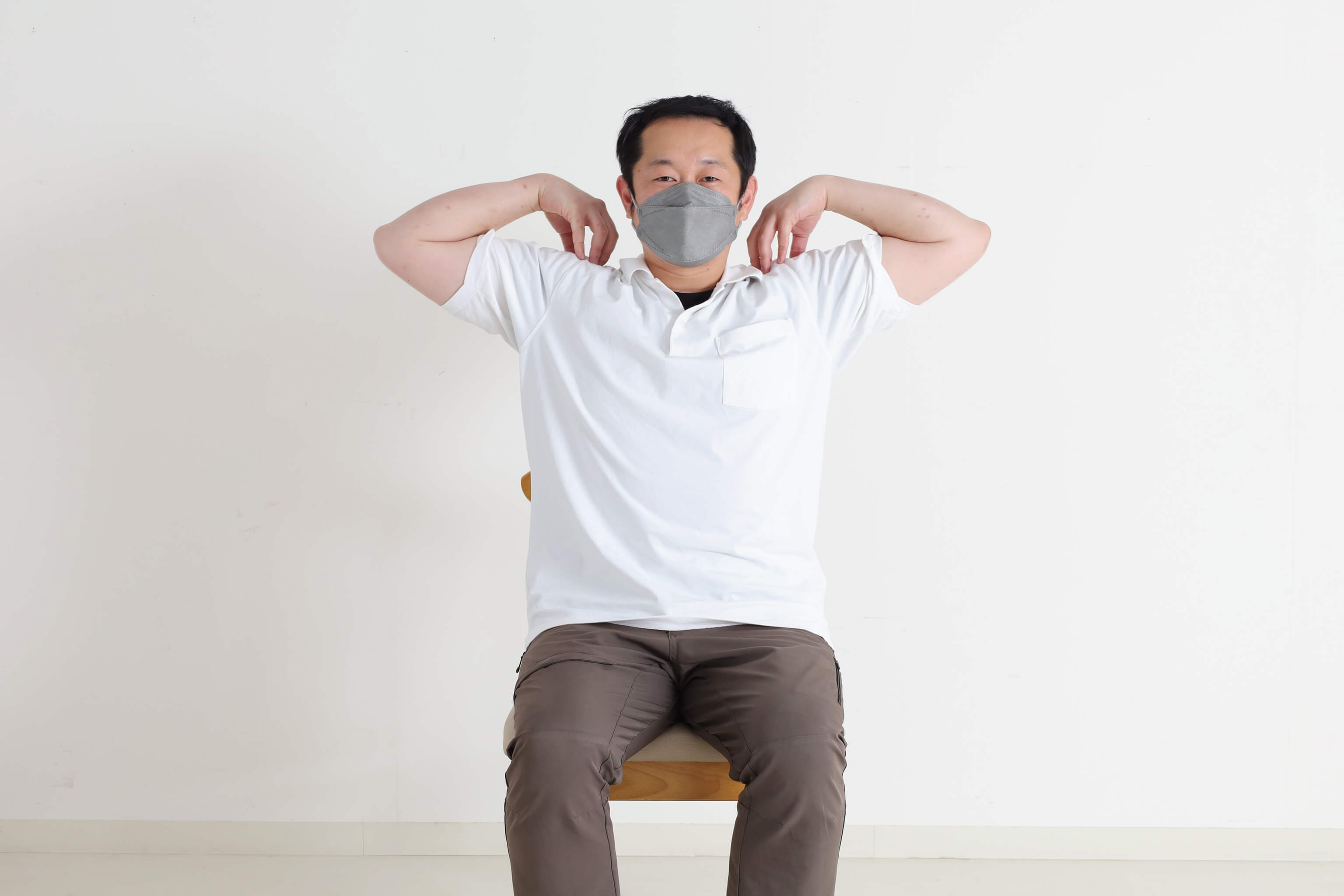 3. 両肩に手をおき、肩で円を描くように肘を動かして回す