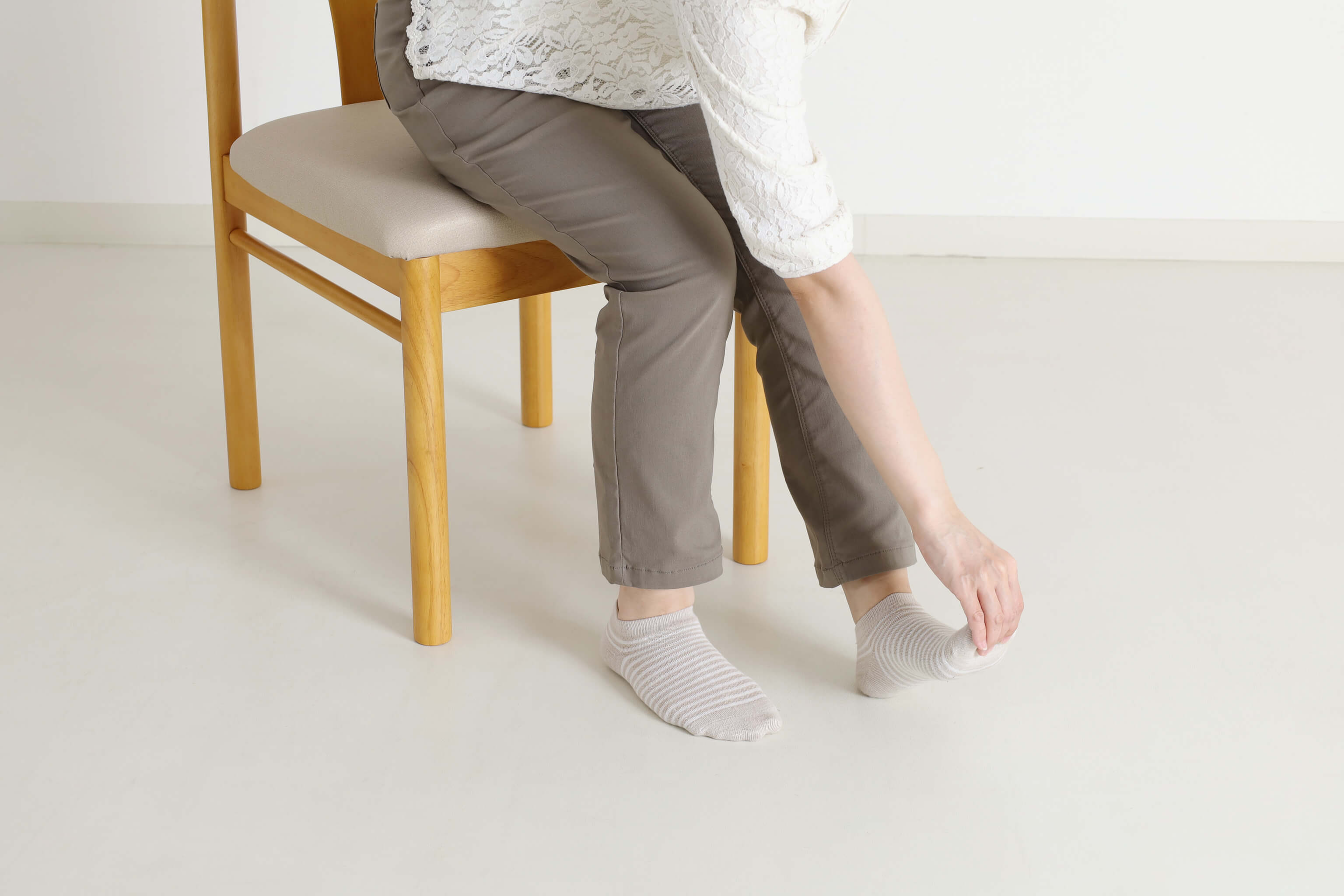 靴下や靴をはく動作が難しくなってきたな、という人には、腰の柔軟性を高める体操もおすすめです。ただし、椅子からの転落には十分に注意しましょう。