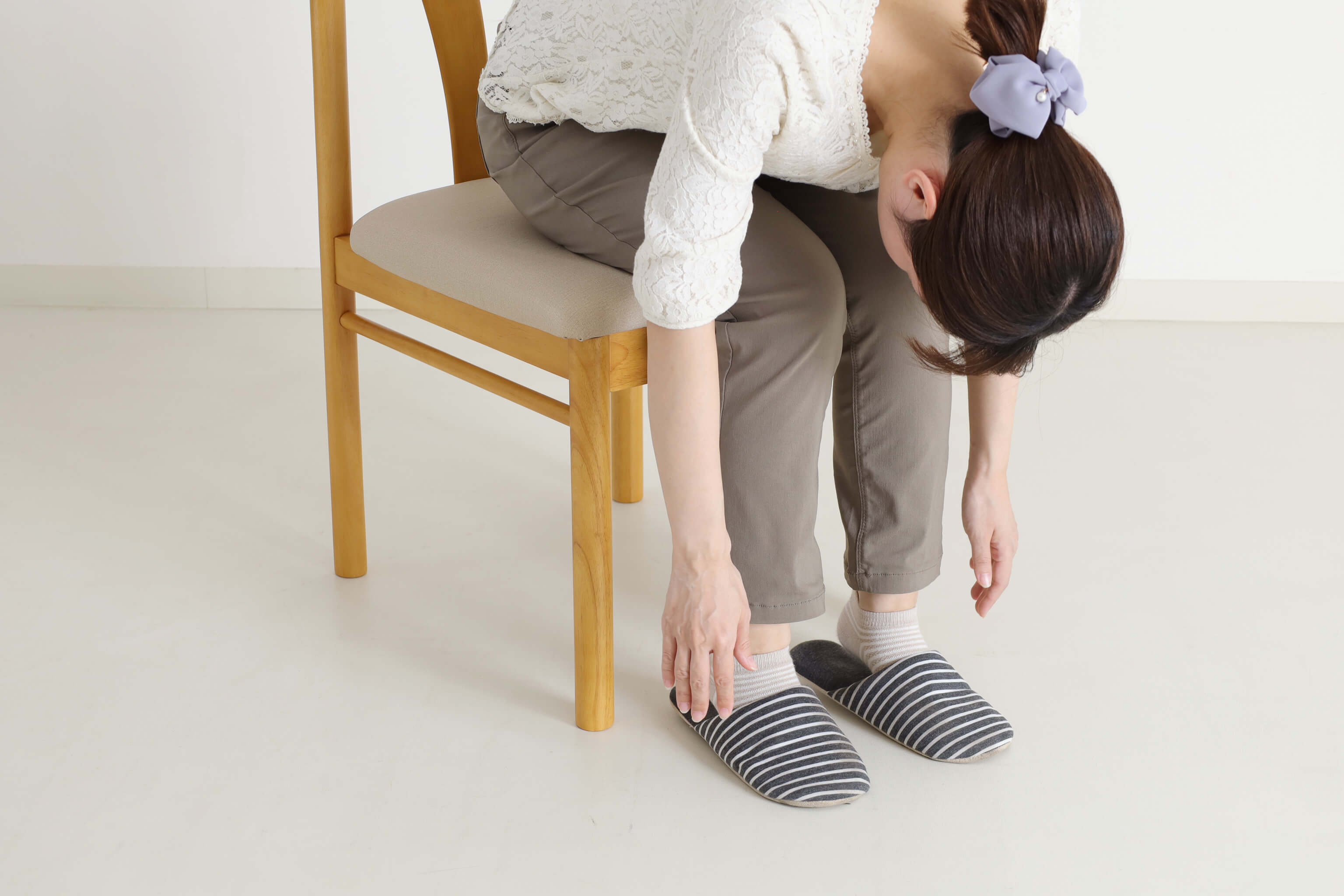 バランスを保つのが苦手で前へ転んでしまいそうになる方は、椅子に深く腰かけて太ももに手を置いたままかがむだけでも良いでしょう。