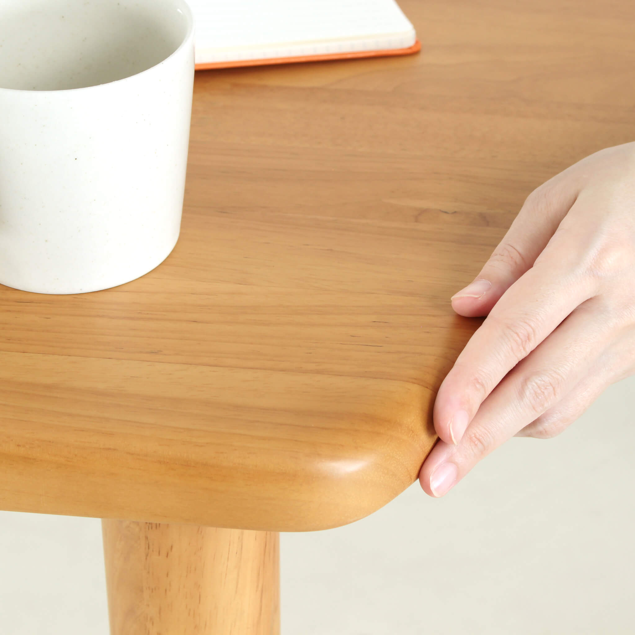 そして、天然木ならではのやさしさや暖かみが感じられるだけでなく、全体的に丸みのあるフォルムとなっており、安全にも配慮しています。天板は適度な厚みがあり、握力が弱くなった方は手を置いて身体を支えることができます。手をついた瞬間のヒヤッと感が少なく安定性も高いため、体重をかける際の安心感があります。