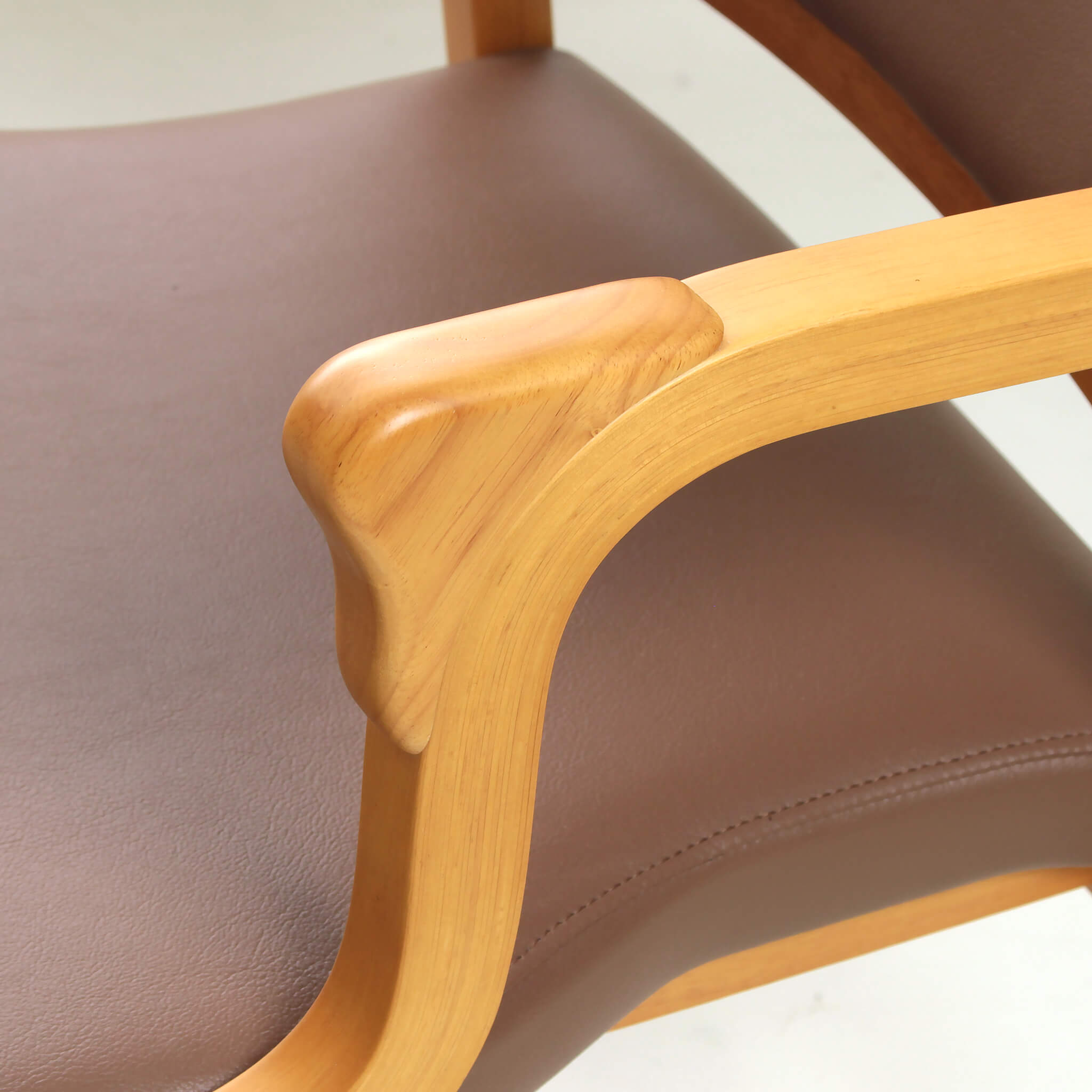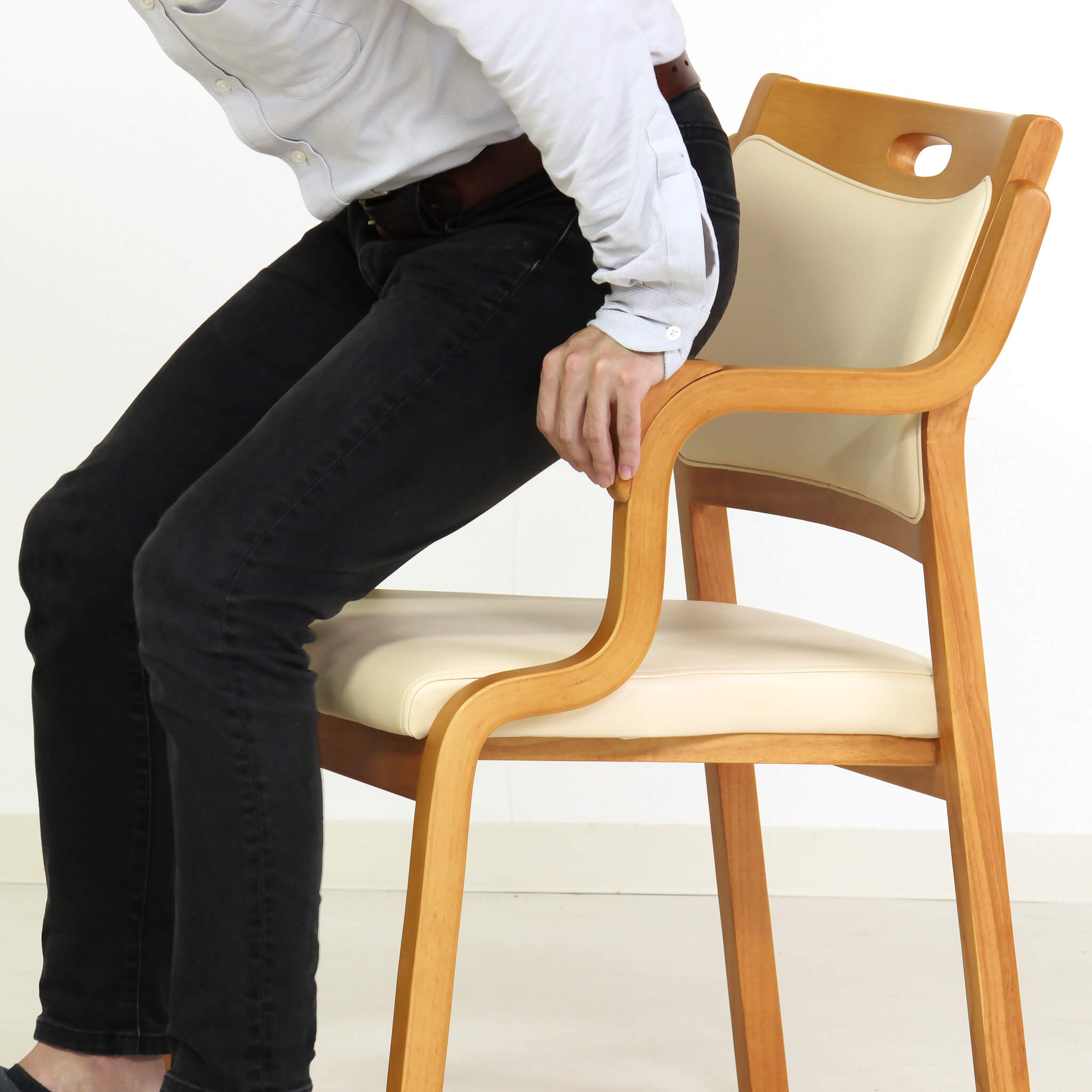 長年にわたり、介護施設でもよく選ばれている製品です。肘おきの部分は三角グリップでしっかりと握ることができ、手のひら全体で支えることができます。握力が弱くても掴みやすい形状で力の入りやすい位置にあるため、足腰の弱くなった人や握力が低下した人も立ち座りしやすい点が特徴です。 また、木材を幾重にも重ね強力に圧着した高強度の積層合板フレームは、非常に耐久性が高く、体重をしっかりと預けることができます。