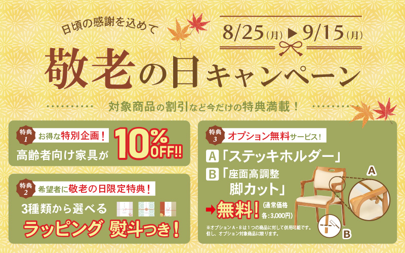 敬老の日は、日頃の感謝の気持ちを伝える特別な日。椅子の工場では、期間限定価格の素敵な特典付き商品を取り揃えています。